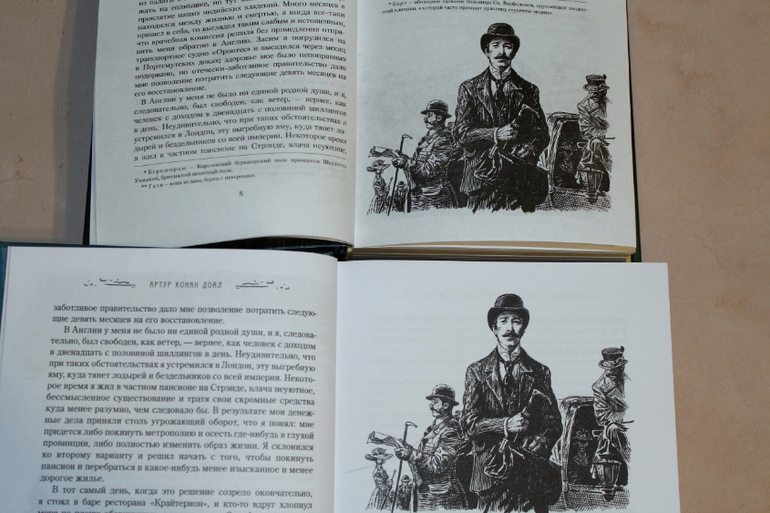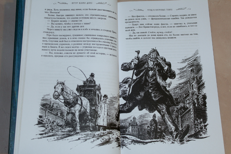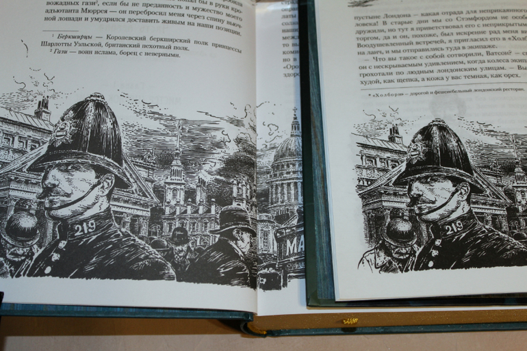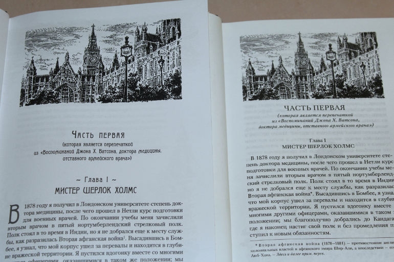 Подарочное издание больше по размеру. Шерлок на обложке объемный. Создается впечатление, что он выглядывает из окна. Название тоже объёмное. Золотой срез симпатичен, но особого доверия не внушает, краска остается на пальцах. Надеюсь, что после прочтения срез не поблекнет. Издана книга отлично. Бумага плотная, белая, каптал, ляссе всё идеально. Это и не удивительно, книгу печатали в Латвии. За счет большего формата книги увеличены и иллюстрации. Некоторые, как я заметила, поменяли местами. Не понравилась нумерация страниц, цифры совсем не понятные, но для меня это мелочи.