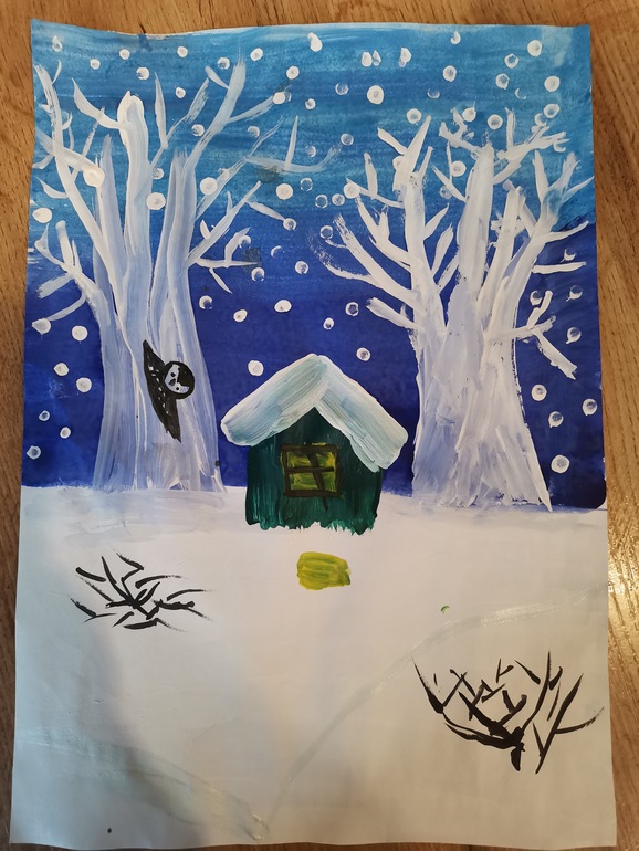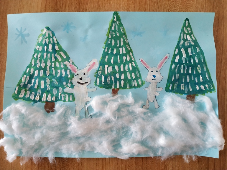 Дети раскрасили елки, сугробы и домик, а я покрыла елочки блёстками.