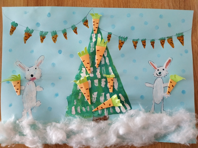 Отправились Зая и Пушистик искать самую красивую в лесу ёлочку. Долго искали. Устали. И тут увидели они полянку с красивой, пушистой ёлочкой. Украсили эту ёлочку зайчики морковкой!