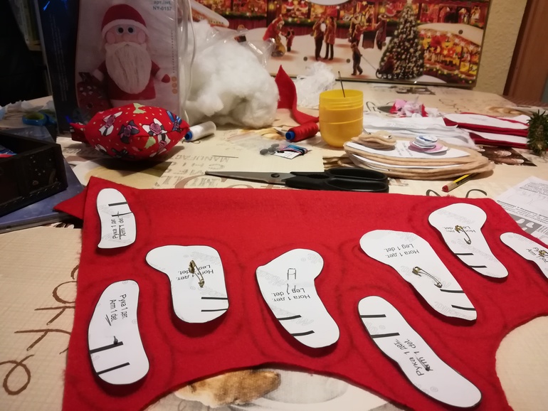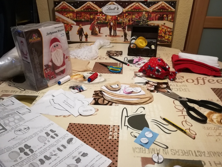 Хорошо, что на чай зашли бабушка с дедушкой. Пока бабушка развлекала младшую сестру, старшая с дедушкой изготовили мешок деда Мороза. Я пока начала рисовать и вырезать по выкройке...