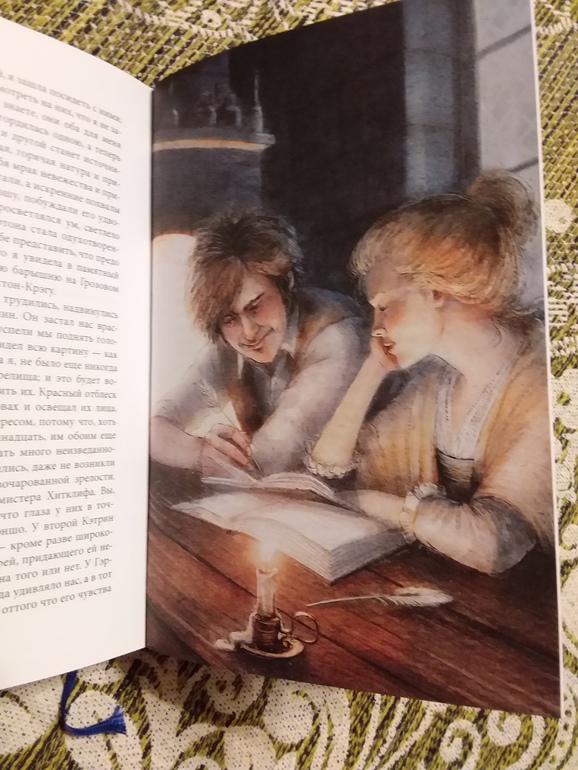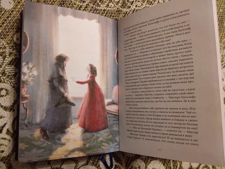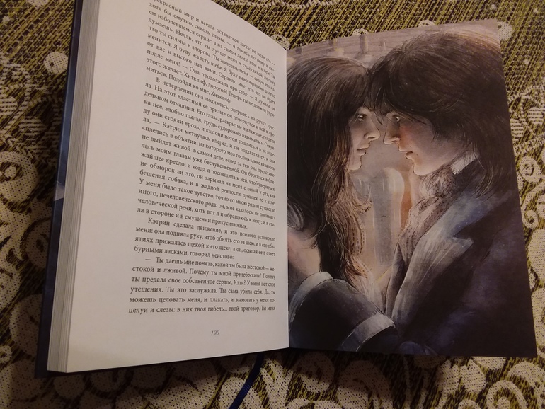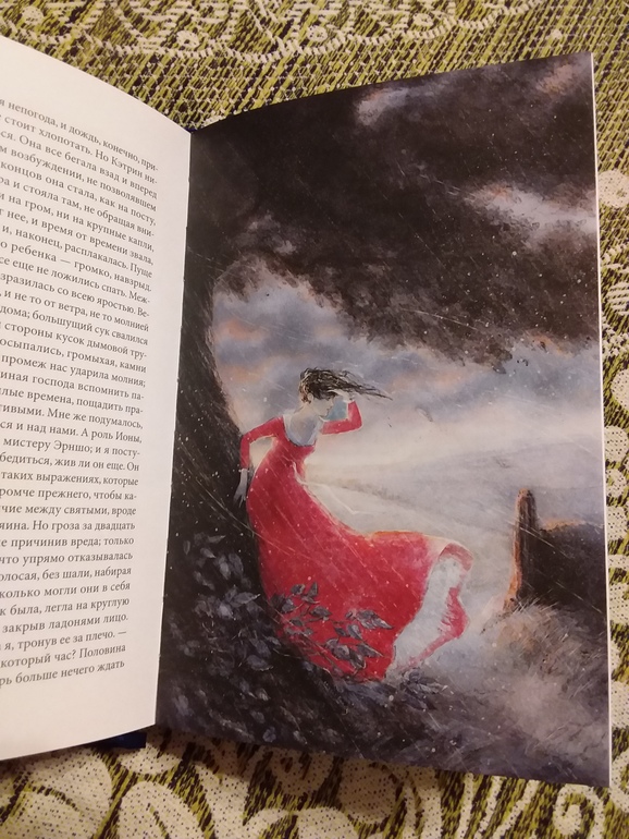 Если честно, у меня была книга от издательства "Песочные часы", но образ Кэтрин - блондинки у меня вызывал диссонанс )... В книге от "Качелей" для меня точное попадание в образы!! Спасибо художнице Елизавете Третьяковой (новое для меня имя). Шрифт в книге комфортный, минусов пока не нашла ). Наверное, пора перечитать про любовь Кэтрин и Хитклифа в новом оформлении! А дальше просто фото