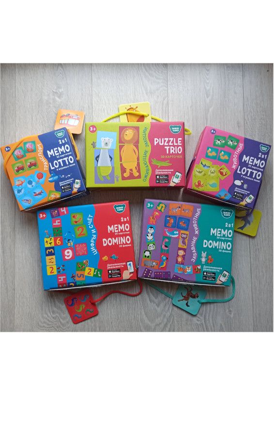 Все карточки и фишки в наборах изготовлены из плотного картона и прослужат очень долго. Яркие и стильные картинки, удобная коробка с верёвочкой-переноской обязательно понравятся вашему малышу.