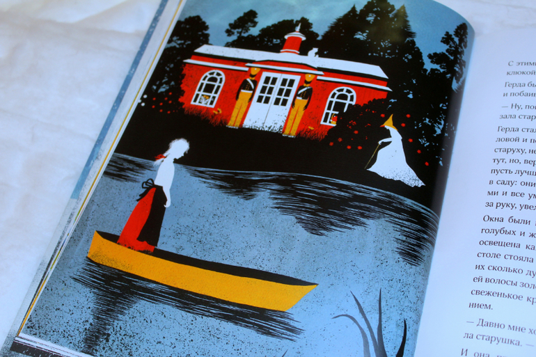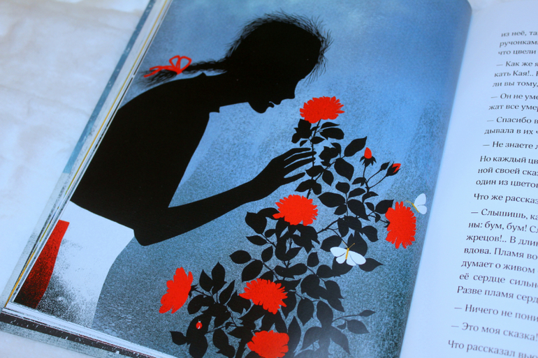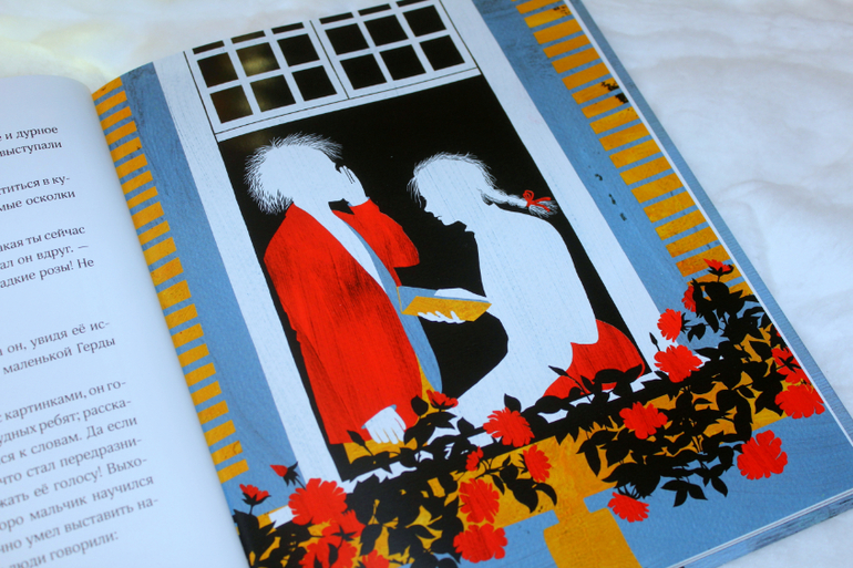 Дочка любит рисовать, и она всегда уделяет большое внимание иллюстрациям, а в этой книге есть на что посмотреть и что обсудить. Несмотря на минимализм в цвете книга невероятно яркая. Резкость в деталях приковывает внимание. Изначально, как нам кажется, художник покрывает лист черной краской. Далее идет голубая и детали прорисовываются красным и желтым цветом. Это завораживает, чем не волшебство?! Видно каждый мазок кисти и это придаёт иллюстрациям жизнь, мы такое очень любим. Название каждой главы как отдельная картина. Буквицы тоже заслуживают пристального внимания. Стиль Натальи Акимовой не спутать ни с чьим другим. Яркая индивидуальность. Даже сама Снежная королева у Натальи Акимовой не похожа ни на одну другую. Наталья изобразила ее не как красивую женщину с гордым, равнодушным взглядом, а лишь как женский силуэт, который образуется из скопления снежинок. Это оригинальный и один из самых верных решений. Во время метели каждый ребёнок сможет увидеть эту Снежную королеву за своим окном!