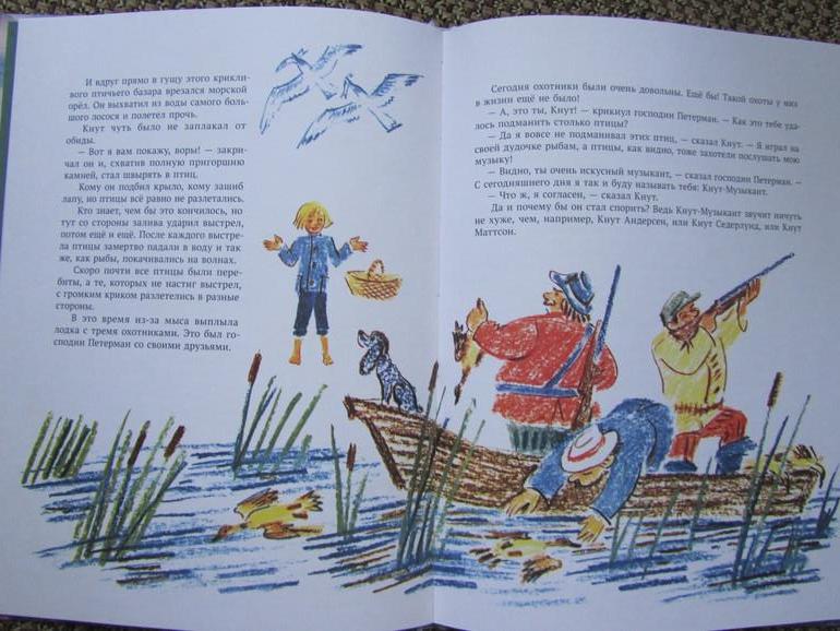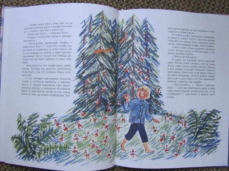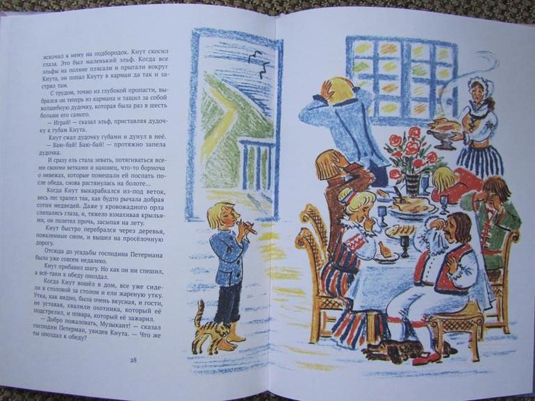 Сама история про мальчика, нашедшего волшебную дудочку, которая помогла ему в его внезапных приключениях. Где то прочитала, что здесь немного урезанная версия сказки, хотя вроде написано, что перевод классический Любарской, но нам всё понравилось, повествование логичное. Много интересных необычных даже героев (эльфы, великан, горный король), прям сразу видно, что писатель скандинавский)) Книга большого формата, листы плотные, шрифт средний , для самостоятельного чтения школьникам 2-4 классов подойдет.