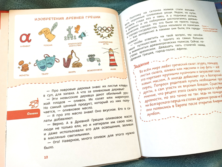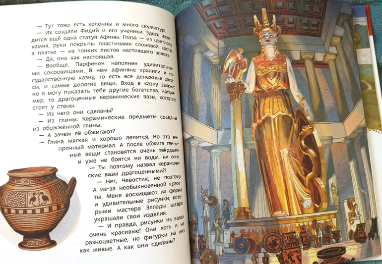 Я прочла «Древнюю Грецию» чтобы убедиться, что планка не снижена. Сначала читала поверхностно, кусками, но быстро втянулась - потому что интересно. ))) Темы всем знакомые: боги, олимпийские игры, наука, изобретения, искусство, театр. Но раскрыты эти темы, на мой взгляд, немного с другой, с непривычной стороны. Не могу точно выразить с какой, но интересно же!