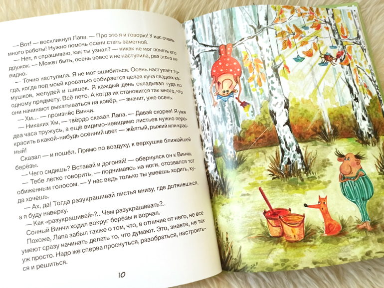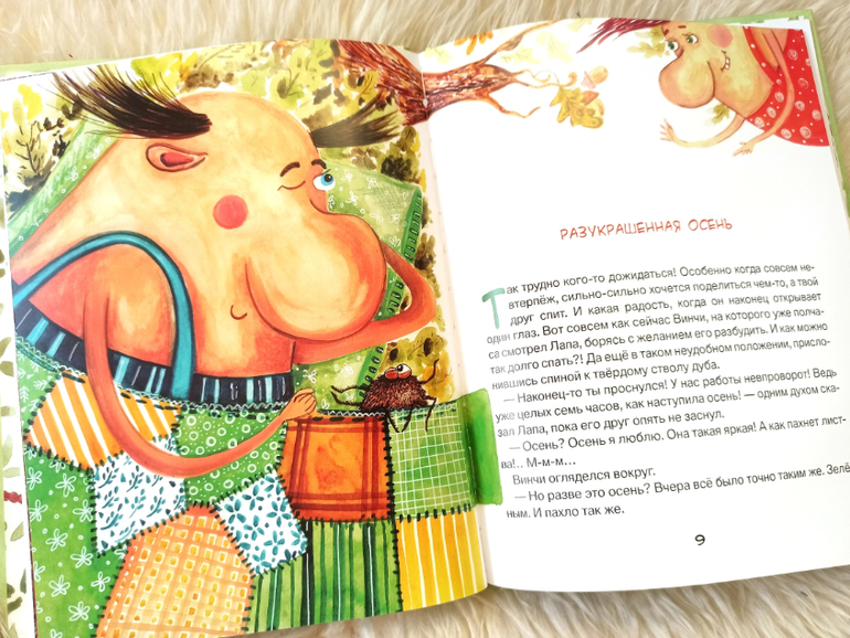 В другой истории герои раскрашивали листья на деревьях, чтобы поскорее наступила осень. И совершенно замечательно их стремление помочь дедушке Уф не замерзнуть - ему они принесли шубу из паутины и пуха.