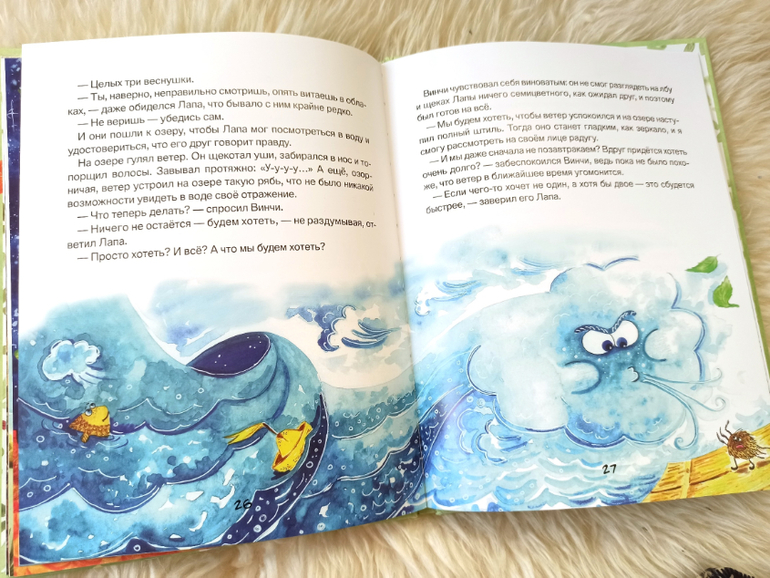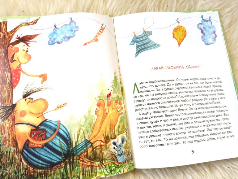 Книга состоит и нескольких отдельных историй про забавных человечков Лапу и Винчи. Человечки яркие вышли, у каждого свой характер, привычки - автор прописал их так, что в воображении они стали сразу нашими хорошими знакомыми. Самое главное: они очень добрые, веселые и любознательные - мне приятно было читать сыну про таких ребят.