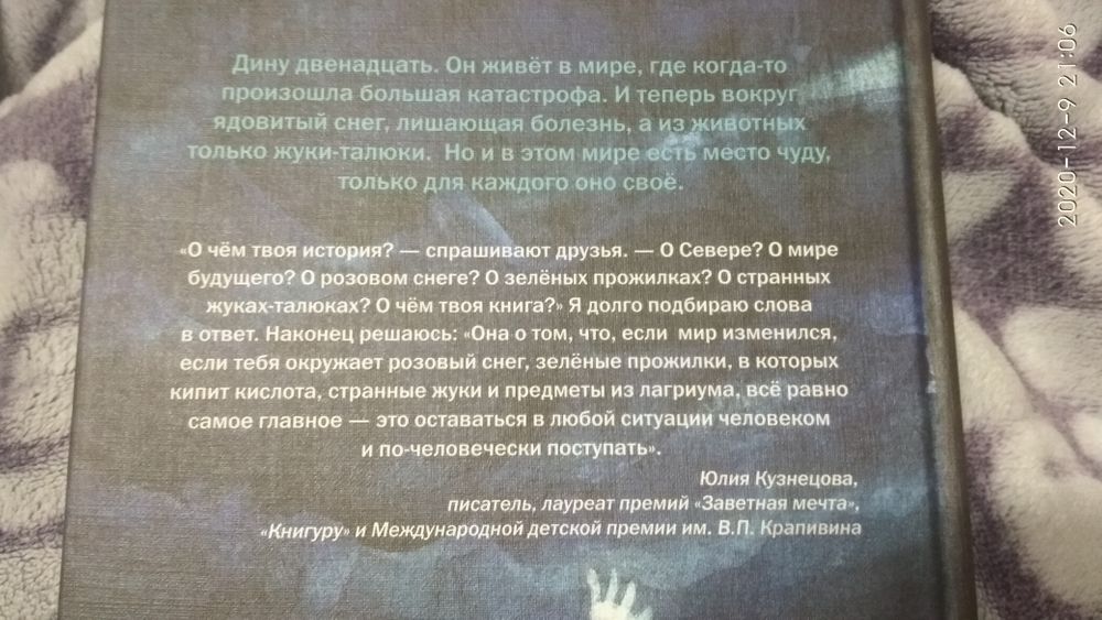 История небольшая, даже можно сказать маленькая и читается очень быстро. Текста на страницу совсем не много. Стоит 6 +, а в описании написано для детей среднего школьного возраста. Герою книги 12 (почти 13) лет, но думаю, что читающим детям можно читать и в 9-10 лет. Книга заинтересовывает сразу, розовый снег, лишающая болезнь. И как-то я ждала, ждала, что сейчас как все начнется - начнется! Но вот уже скоро конец книги, а так для меня ничего и не началось. Эх. Видимо снова я много от этого ждала, или не мой возраст, не мое настроение. Ведь как важно, чтобы книга попала в твое состояние! Помню, как первый раз читала Пикник на обочине, как я плакала. О чем это книга была для меня? О безнадежности, о желании быть свободным по-настоящему, о рамках и желании быть счастливым. Потом я книгу перечитала, но таких ярких впечатлений уже не было, лучше бы вообще не читала второй раз, решила сохранить первые мысли о книге. Так вот и здесь, я как-то ждала, что меня эта книга зацепит, что захочется думать, рассказать о книге (про книгу Первая работа я, по-моему, уже всем кому могла рассказала). А тут… Не знаю… Надо дождаться, чтобы сын прочитал, может у него эта книга выстрелит. Мне кажется, что в его возрасте эта дилемма будет понятней. Про что книга История северного круга для меня? Про то, что утрачены знания! Вместе со "старой" жизнью, землей, пока люди выживали, было утрачено все историческое наследие и теперь люди по крупицам все собирают, придумывают, изучают.