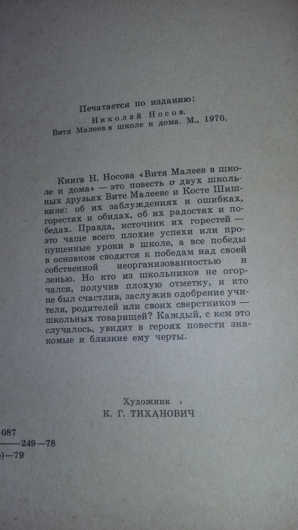 Витя Малеев - ну это классика. Читать задала учительница в школе, Витя в книге учится в 4 классе, как и моя дочка, конечно книга понравилась) У нас старенькая бука, еще я ее читала, издана в Минске - мамино приданое. Вот такой забавный форзац: