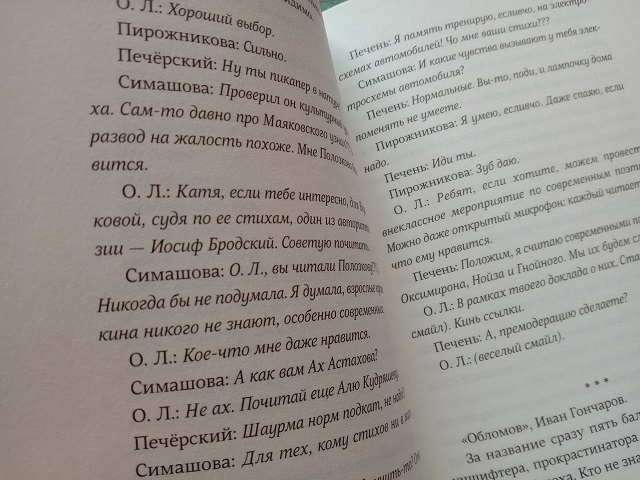 Это то, что на поверхности. Если заглянуть чуть глубже, то за этими "разборами полётов" классиков 16-летним мальчишкой стоит фигура опытной и увлеченной своим делом учительницы Ольги Леонидовны. Спокойно, без нажима, но очень убедительно и верно она направляет мысли Захара в нужное русло, резюмирует и помогает осознавать и формулировать выводы, к которым с самого начала его ведёт: "есть жизнь с русской литературой и без неё", литература меняет человека, помогает открывать новое в людях, по-другому смотреть на окружающих и на себя. И, словно в подтверждение, параллельно с дневником чтения Захара мы видим возникающие и меняющиеся взаимоотношения между ним и его одноклассниками: соседкой по парте Симашовой (на которую неожиданно он смотрит под другим углом, и угол это ему очень даже нравится), отвязным другом Печёрским и местным техническим гением Пирожниковой.