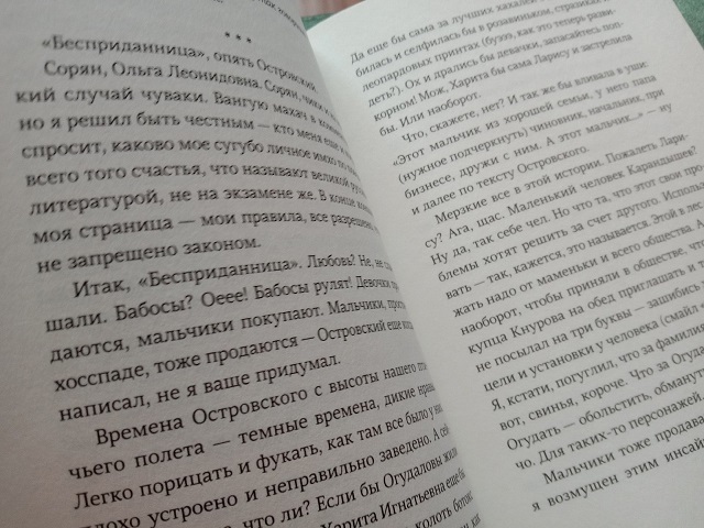 А теперь мнение, собственно, целевой аудитории. То есть моей личной 9-классницы) Что касается описания сюжета произведений и мыслей по их поводу, ей очень понравилось. Особенно про "Горе от ума". По ее словам, "доступно и без заумных словечек", хотя, как и мне, ей показалось многовато сленга, некоторые слова насмешили (особенно ее прикололо слово "френды"), говорит, что подростки так не выражаются. А вот концовка ее разочаровала. Считает, слишком предсказуемо и неправдоподобно: нечитающий подросток полюбил чтение, проникся классикой и по собственной инициативе прочитал "Войну и мир". Её вердикт: "Так обычно книги и заканчиваются. Банальщина."