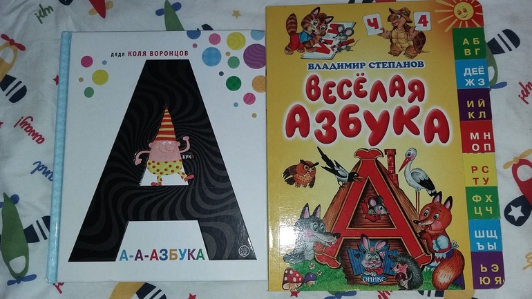 Азбуки забавные, у Воронцова можно искать предметы на определенные буквы, да и вообще смешные картинки, у Степанова хорошие стихи для запоминания букв.