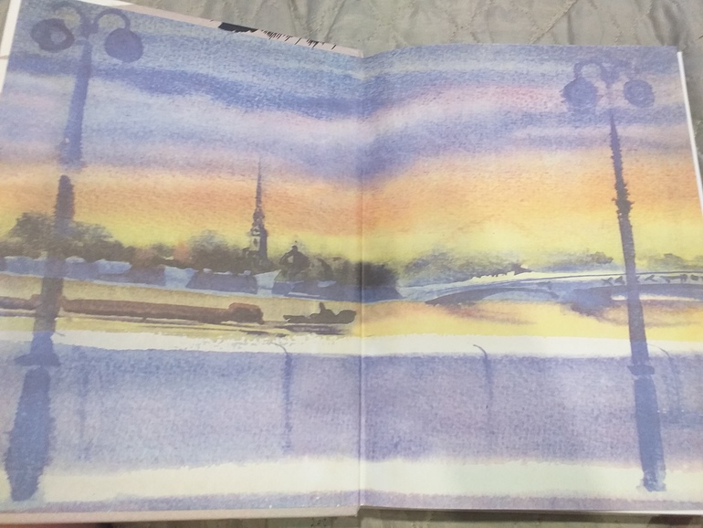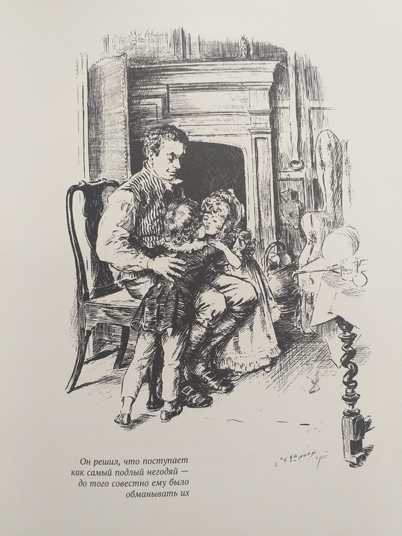 Внутри плотный гладкий офсет тёплого кремового оттенка и винтажные иллюстрации Чарльза Брока. Поля огромные, текст крупный, зачастую оборотная сторона страницы с полноразмернрй иллюстрацией пустая. Там всего-то 94 страницы, а с учётом такого количества свободного места получается, что текста совсем немного.