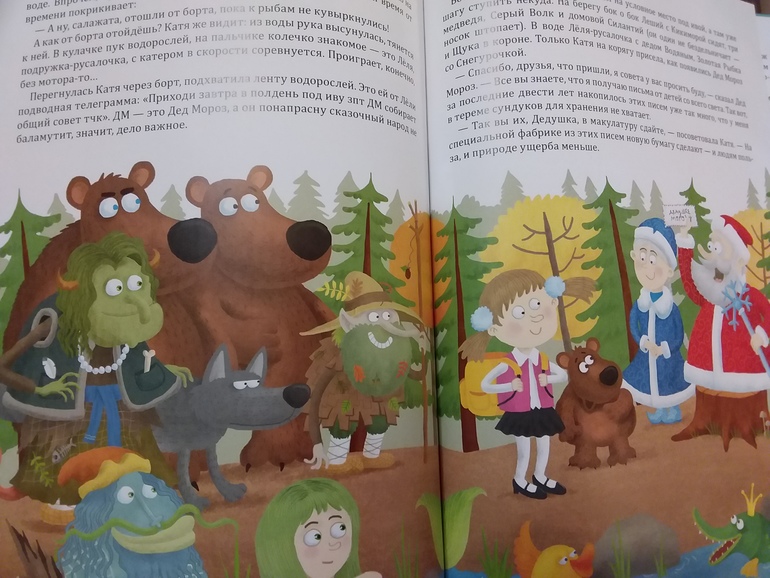 Да и книга куплена случайно в период скидок 85%, и я была уверена, что покупаю раскраску за эти деньги )). Книга пролежала полгода и попала в предновогоднее чтение. Пока не дочитала, детишки меня не отпустили. О хорошем - дети от книги в восторге, особенно, дочка. Ну она у меня любительница всего сказочного и волшебного. "Вниз по волшебной реке" года два назад была ни пике популярности). Так что если вам нравятся подобные книги, то и "Дедморозное утро" вполне может заинтересовать. Книга рассчитана на старший дошкольный или младших школьников по манере написания, но вот что я не пойму - Зачем там "Муму"?. Когда девочке надо заплакать, она берет "Муму". У меня дочка во втором классе, я еще и не думала о Тургеневе для неё. Так что надо объяснять, что это за книга. Из плюсов же, что ребёнок современный, с техникой знакомый, так что на Новый Год ребенок просит спутниковую тарелку ). Сюжет достаточно простой - семья Кати переезжает в "глубинку", ей скучно и Дед Мороз дарит ей способность видеть и понимать волшебных существ. Так мы знакомимся с Русалкой, Снегурочкой, домовым Силантием и другими сказочными персонажами. Так что всё, как дети любят.