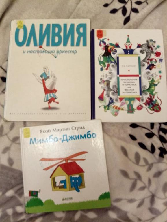Оливию и Мимбо-Джимбо брала скорее для старшего, для самостоятельного чтения. Поскольку техника чтения ещё, увы, не на высоте, большие объемы утомляют и отбивают охоту читать. А такие совсем малышковские читаются легко за один присест. Ну и младшему тоже ещё было интересно. Хотя истории, конечно, совсем простенькие, на разок. (Прошу прощения на качество фото).