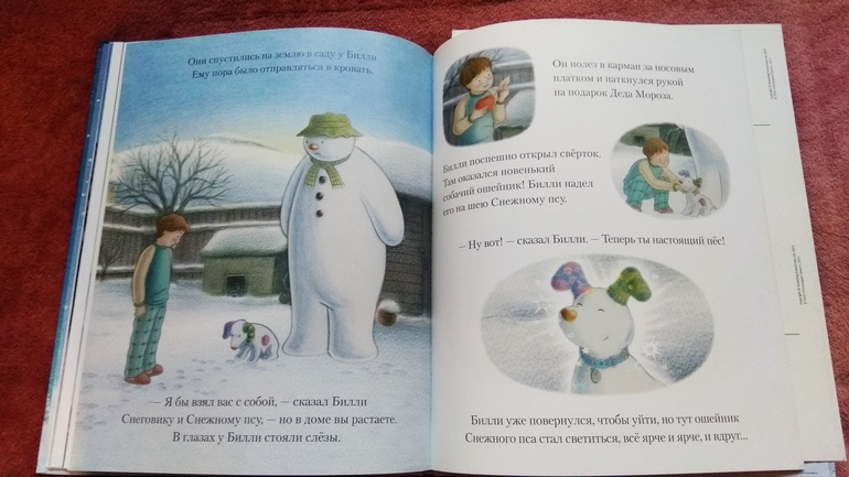 Снеговик и снежный пёс. Добрая-добрая история про мальчика. Мы читали ее в прошлом году, честно я не знала мультик и книгу первый раз читала сразу вместе с ребенком. А там вначале смерть его любимой собаки, от старости и к этому надо быть готовой. Но пришлось спокойно объяснять - что так бывает. А дальше мальчик лепит снеговика и пёсика и улетает в сказочное путешествие! В конце он получается лучше подарок на свете, снежный пёс стал настоящим щенком! Очень приятная история, кстати мечтаю слепить именно такого снеговика - с мандаринкой))) а в этом году мы посмотрели мультик. Эх, я ревела... И снеговик растаял в конце, и сквозь слезы объясняла Теме, что снеговик попал в сказочный мир к Деду Морозу. Тёма конечно запомнил про собачку и как они летали. Тут скорее наши взрослые эмоции они пересиливают детское впечатление!