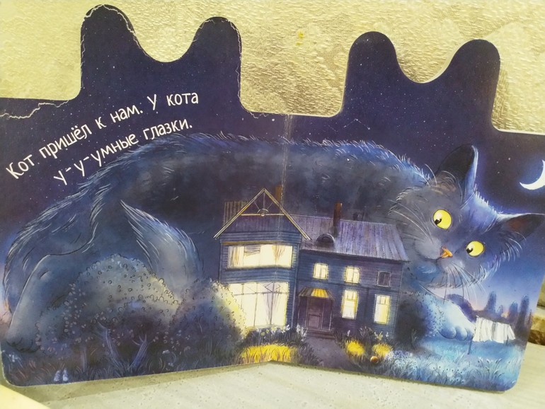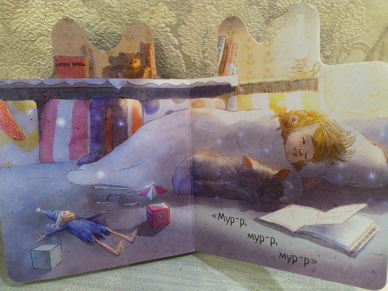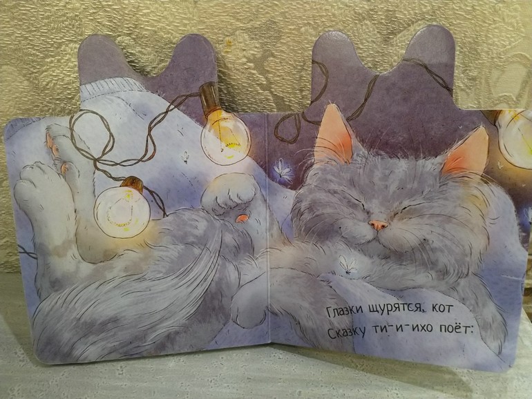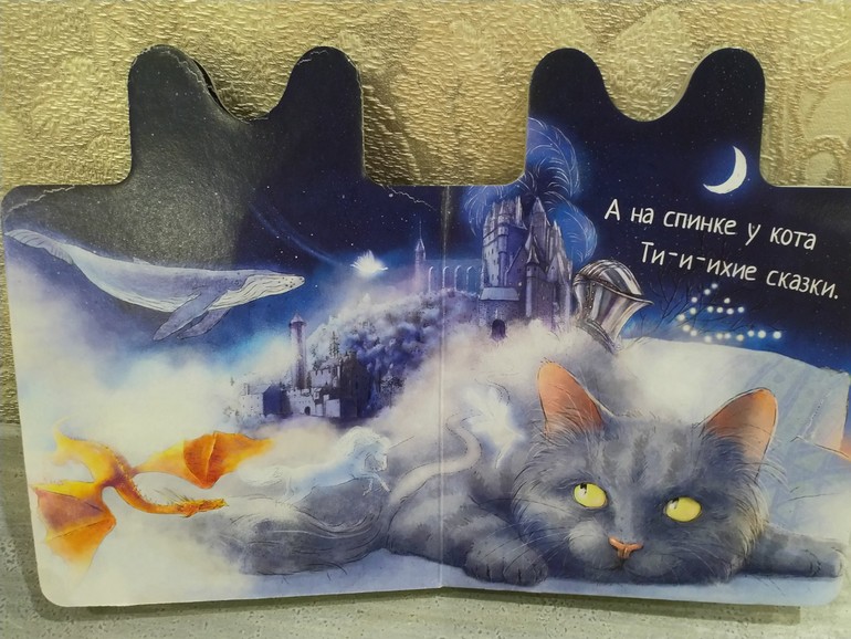 5. Котик. Вообще не сильно мне она нравится. Всего 4 листа, картон очень плотный. Такая книжка картинка на тему сна, что котику снится и пора баиньки)) Покажу её целиком.