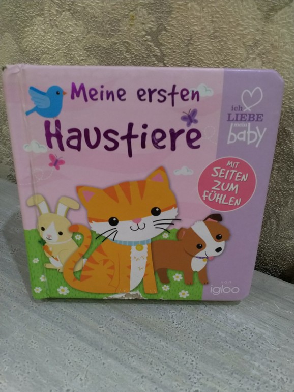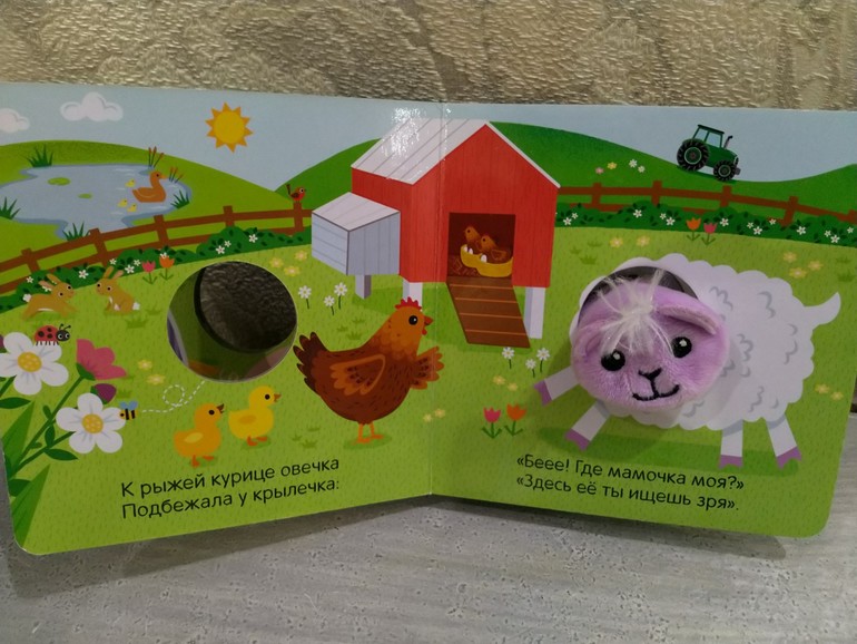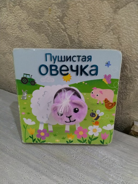 Книга с пальчиковой игрушкой, в которой овечка ищет маму и в конце находит. Тоже очень любима, дочка жалеет её, гладит и говорит найдём, не переживай))))