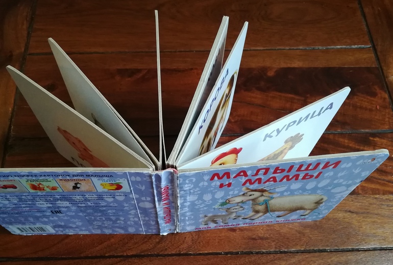 Животные и детёныши. В ней на развороте картинки и названия животного и его детёныша. У нас есть ещё одна книга из этой серии Малыши и мамы с домашними животными, но она перед фотосессий спряталась. Эта книга тоже клееная-попереклееная, переплёт укреплён тканью в несколько слоёв. Удивительно, но эта картонная книга порвалась в руках маленькой читательницы относительно быстро даже в сравнении с бумажными книжками. При этом после проклейки переплёта тканью держится уже железно и не требует дальнейшего восстановления. UPD: нашлась вторая книга: