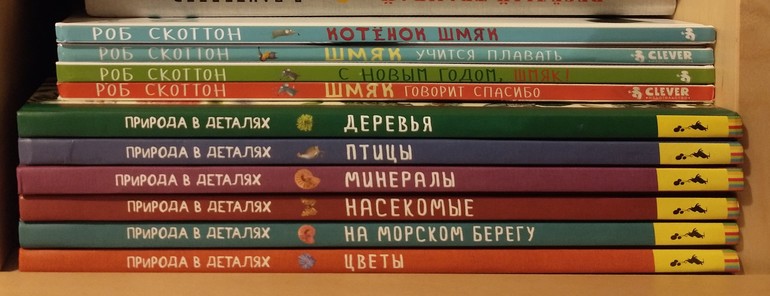 Ещё она научилась со скамейки доставать до ручек книжного шкафа и открывать его. И достаёт она оттуда с завидным постоянством только две серии - про Шмяка (ну нравятся ей котята) и про природу в деталях, потому что там ужас, как много разных картиночек на обложках!