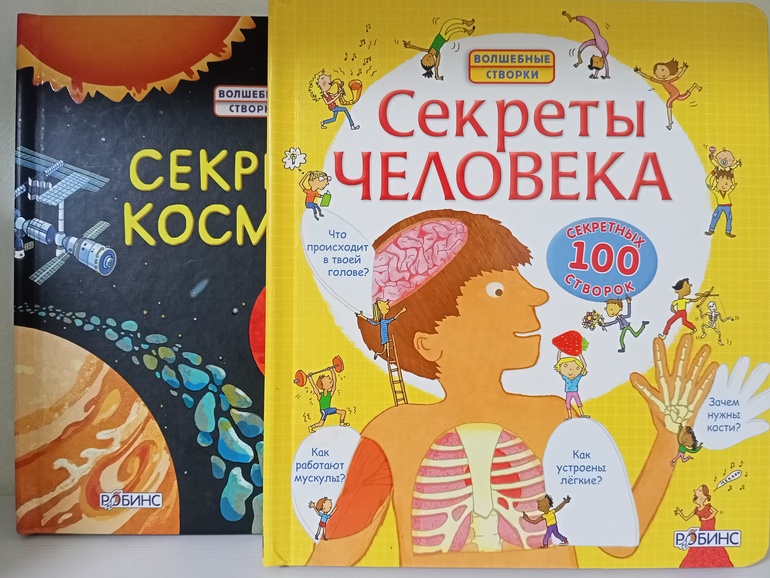 3. Энциклопедии и от издательства Робинс, серия "Волшебные створки". Это настольные книги сына, на полку не убирает. "Секреты человека" чуть более любимая. Мы читаем книги вместе, показываю им где, что расположено. Информацию дополняю примерами, и конечно, детям нравятся открывать сами створки. У нас только две книги, но сколько интересных книг вышло ещё у Робинс. Все интересные и познавательные, для первого ознакомления ребенка с темой, очень хороши.