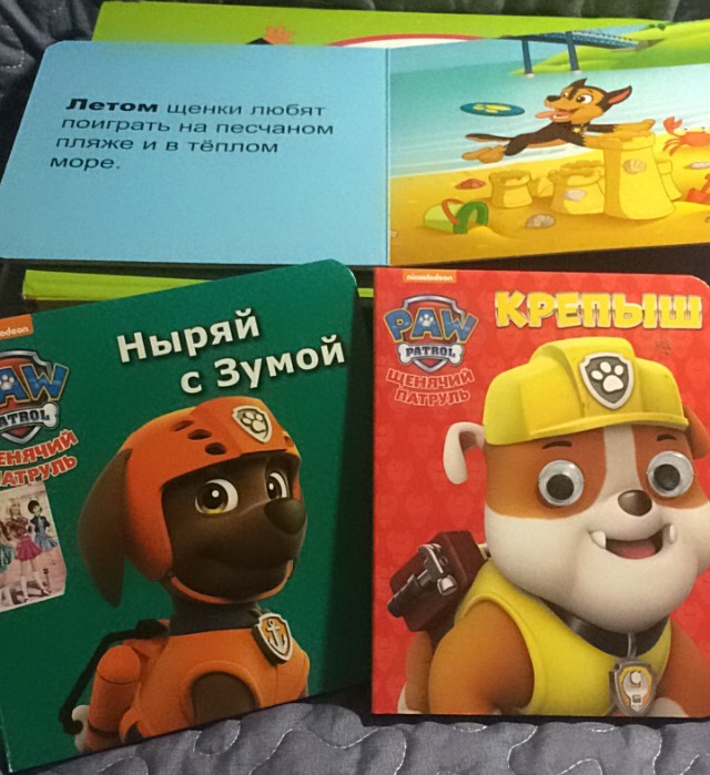 Мультики Вика смотрит очень ограничено. Хотя ей хочется, и она часто просит. Но я дозирую. Предлагаю ей, конечно, разные мультфильмы, на данный момент чаще всего просит "Щенячий патруль", в связи с этим пройти мимо книг с любимыми героями в книжном не может))
