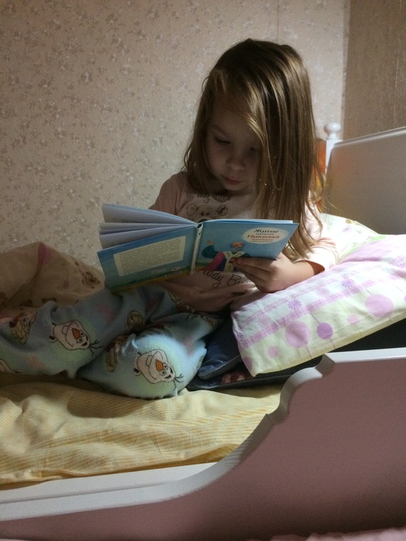 В день памяти Святителя Николая Вика нашла подарочек под подушкой. Узнав, что игрушку принес ей Святой Николай, пошла в домашней библиотеке отыскала книгу о его жизни и принялась изучать:)