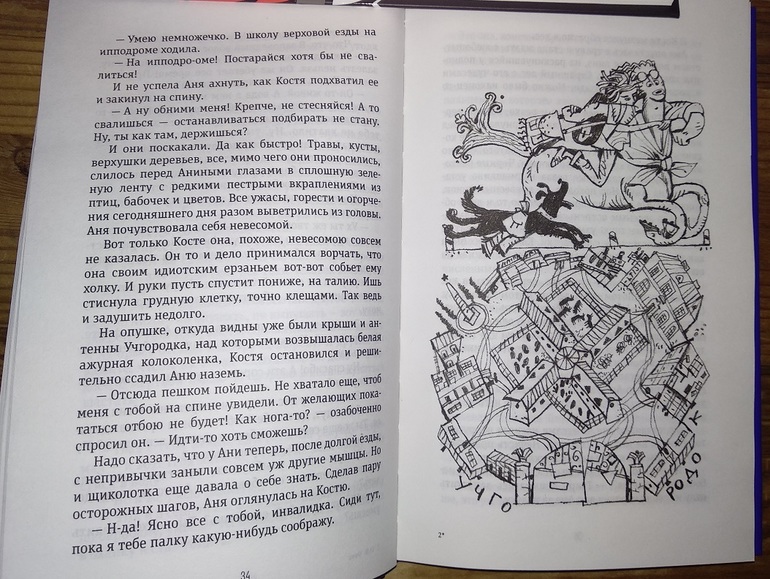 Зато в этой непролазной глухомани главная героиня Аня сразу знакомится с бабой Ягой (Ядвигой Леокадьевной), молодым кентавром Костей ("гнедой Костя в камуфляжной майке, передвигавшийся мягкой и плавной рысью, абсолютно органично вписывался в пространство", если представить эту картину в красках - это что-то с чем-то)