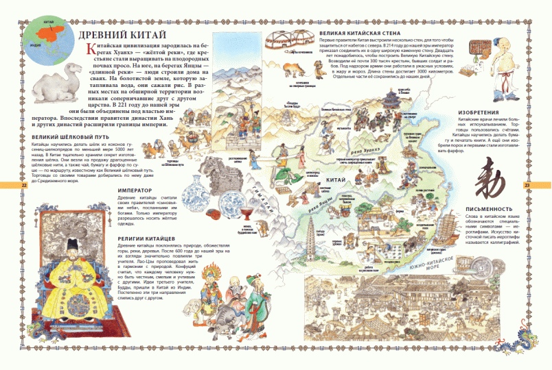 Миллионы лет назад на Земле появились первые люди. Человек научился добывать огонь, строить дома и шить одежду. Шли годы. Люди придумали алфавит, возвели прекрасные города и научились создавать удивительные по красоте вещи. С атласом "Древний мир в картинках" легко совершить путешествие в прошлое. Лаконичные тексты и наполненные деталями иллюстрации помогут представить, как жили люди в Древнем Египте, во что одевались в Древней Греции и Риме, чем занимались в Древнем Китае, Индии и Японии. А главное, узнать и запомнить, чем современный человек обязан древним цивилизациям и почему память о них сохранилась на многие века.