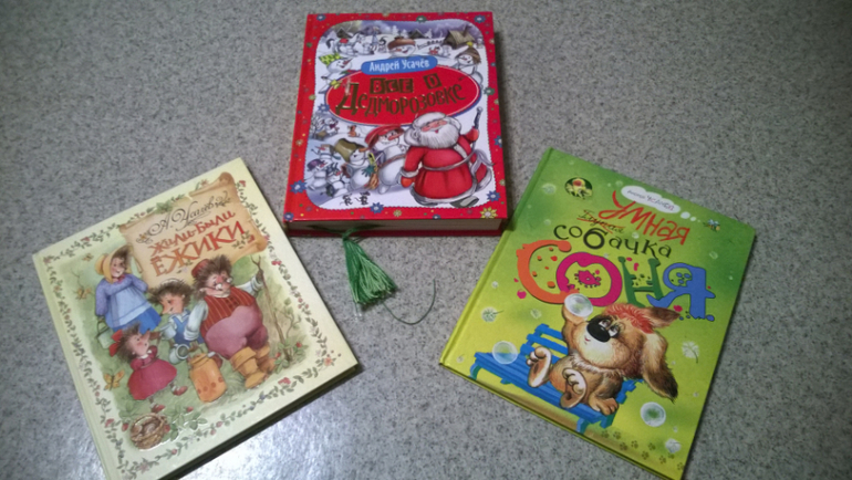 Книги Андрея Усачева. Соня обожаема третьим ребенком. Ёжики поспокойней воспринимаются, но тоже любимы. Дедморозовку читали первый раз. Дочитали уже в этом году, но не включить ее не могла, столько вызвала эмоций. Сын попросил сразу же читать по второму кругу. Но нет, это выше моих сил, книга и так никак не кончалась, а у нас столько другого новогоднего. До сих пор не дочитали стопу. Теперь вопрос: брать ли оставшиеся части? Это ж умаешься читать...