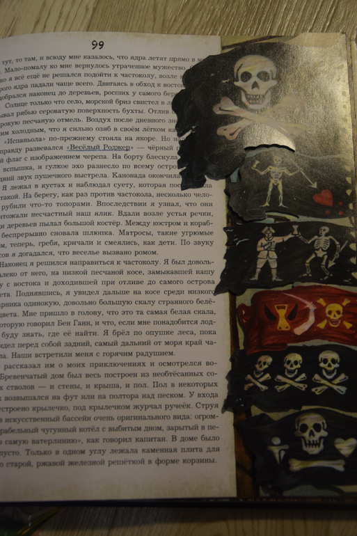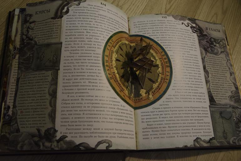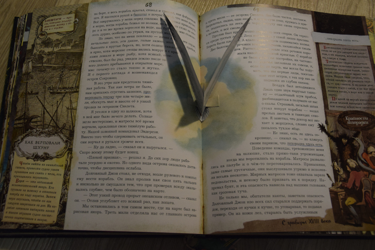 Первым делом Дима рассмотрел карты, иллюстрации, гравюры, плел полдня морские узлы. Но читать книгу сразу не стал. Лишь спустя две недели вспомнил про книгу и прочитал. Оформление видимо ему понравилось больше, чем сама книга. Я лично не читала, ничего сказать не могу, но держать её, рассматривать, читать комментарии очень интересно. Очень красивая.