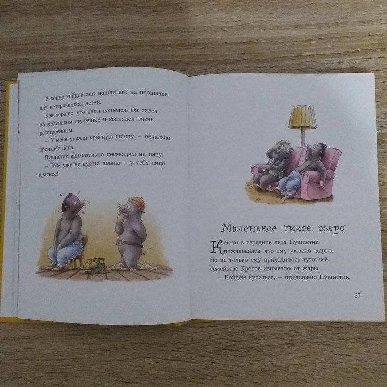 Очень легко и быстро прочиталась. В ней 30 историй, про семейку кротов - папа, мама, бабушка и два кротика - брат и сестра. Дочке понравилось, но так, на один раз. Все же тот кротик для нее лучший. До чтения видела отзывы на Лабиринте, что многим не понравилось отношение автора к папе. Он тут реально такой чудик ))) и день рождения свой проспал, и в дерево на велосипеде врезался и тд. Практически в каждой главе папа накосячил. Когда это было бы в одной главе или двух, то может и забавно, а так не очень. Семейка точно не идеальная, папы могут не понять))