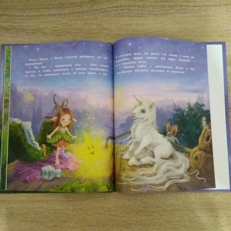 Хорошая добрая история с сюжетом. Волшебная страна, где живут дивные создания. Наш герой, единорог Финя не такой, как все - и рог не выполняет желания, и летать плохо получается. Друзья, летучая мышь Калле и девочка-эльф Трикси, утешают и поддерживают друга. И вот однажды к ним в домик упала с неба любопытная звёздочка, которой теперь надо срочно вернуться на небо. И наши герои берутся за дело. Книга о том, что можно сделать, когда в тебя верят твои близкие. Нам понравилось. Иллюстрации красивые, нет слащавости. Язык объемный, но прочитали быстро.