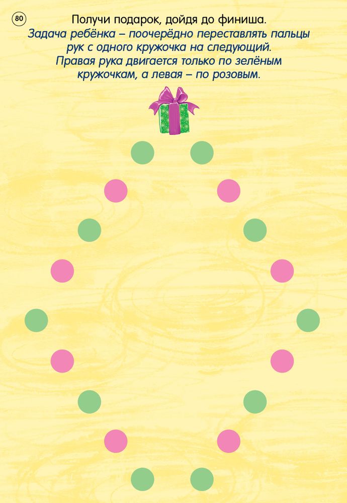 Задача ребенка- поочередно переставлять пальцы рук с одного кружка на следующий. Правая рука двигается только по зеленым кружочкам, а левая - по розовым.