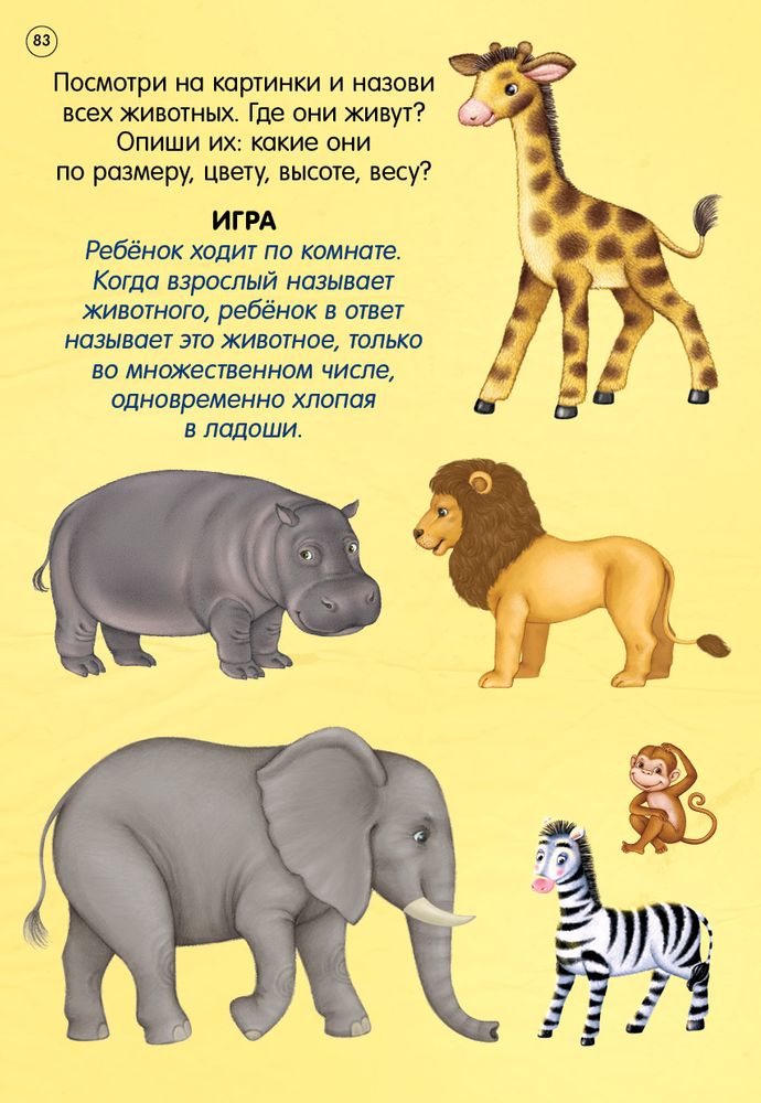 Игра: ребенок ходит по комнате. Когда взрослый называет животного, ребенок называет это животное только во множественном числе, одновременно хлопая в ладоши.