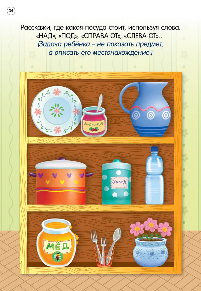 Например, «Расскажи, где какая посуда стоит, используя слова: «НАД», «ПОД», «СПРАВА ОТ», «СЛЕВА ОТ»… (Задача ребенка - не показать предмет, а описать его местонахождение.)