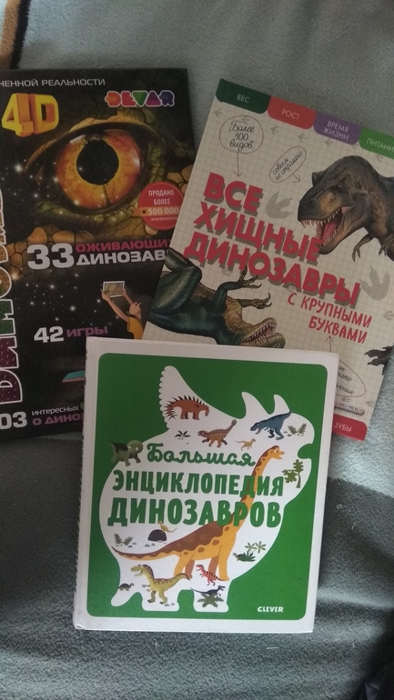 Большая энциклопедия динозавов. Просто любимая книга сына, а я ее не люблю (это мягко сказано). Там куча видов, язык не просто ломается, а просто потом говорить не можешь 😂). Но когда кто жил, из какой эпохи и что любил есть - эту информацию тут про многих совсем нет. Но очень красочно и эффективно для детей))