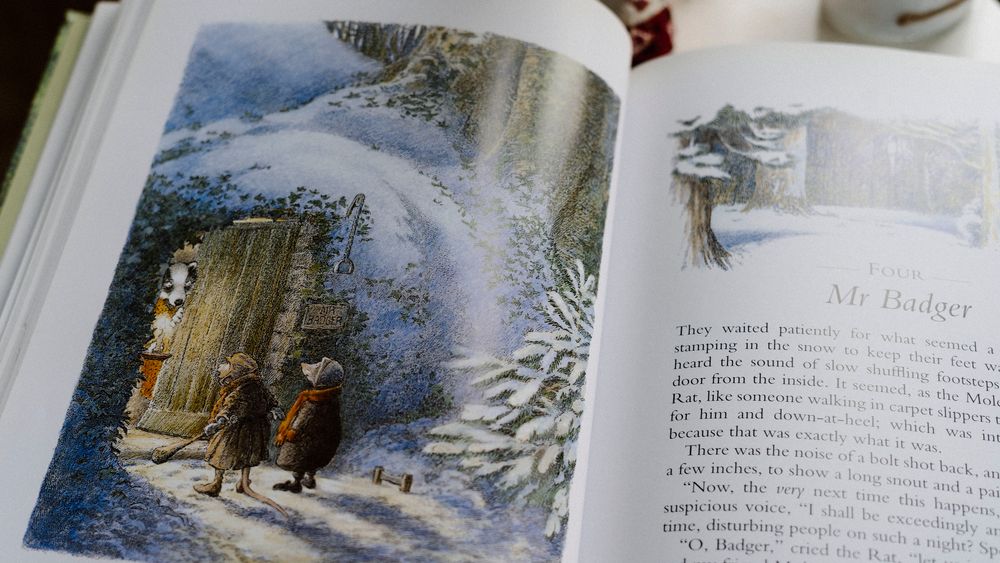 А дальше снова я. В это воскресенье и последующие вечера мы читали отрывок из книги "Ветер в ивах" от главы про Дремучий Лес и снег до Сочельника, который хоть так и не называют, но угадывается он мгновенно, с распевающими рождественские гимны мышками и умиротворяющим уютом домика Крота. Что-то вычитывала из английской книги, потому что иллюстрации есть только в ней. Инга Мур, конечно.