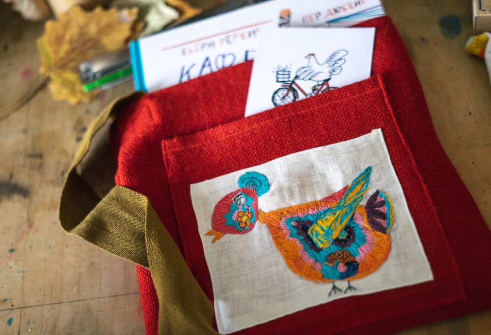 так в очередной май побывали в "Кафе Птичий хвост", пока я вышивала смешную курицу на сумке,
