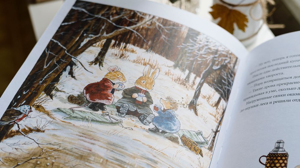 Потом сын удивил меня, он принёс давно забытую книжку. Когда-то их выходила целая серия, но я купила только одну "Приключение в Лисьем лесу" как раз Рождественскую. Читали мы её, когда сыну было пять, и давненько не вспоминали. Теперь, пока я впотьмах тёрла морковку для рагу и резала лук (и рук, как правильно ошиблась сначала)), Лёва читал мне о Харви, Джереми и Ру, а я с удовольствием вспоминала младшие годы сына. Рисунки здесь чудесные, это правда. А текст хоть и ничего особенного, но милый, добрый, и к тревожному чёрно-белому настроению очень подошёл. Это сын безошибочно угадывает. Какая книга к чему подходит.