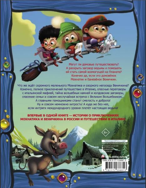 Великолепная книга о приключениях домовёнка Мохнатика и баневёнка Веничкина. Издана в серии "Большой прикольный детектив". Красиво иллюстрирована, имеет большой формат и добротную твердую обложку. Очень приятно брать в руки и листать страницы. Включает две повести о приключениях друзей: первая о приключениях в России, вторая - в Италии.