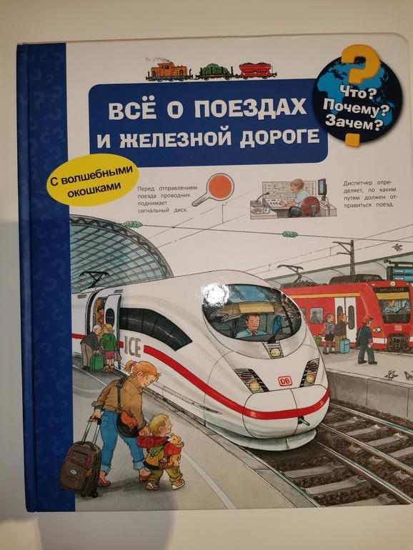 Еще одна книга с окошками "Что?Почему? Зачем? Все поездах и железной дороге. С волшебными окошками". Не самый удачные перевод и сама книга, не очень понятно на какой возраст расчитана, формат с окошками вроде как на 2-4 года, а вот содержание на 5-6 лет. Дочка любит посмотреть, пооткрывать окошки, но рассказывать все приходится своими словами.
