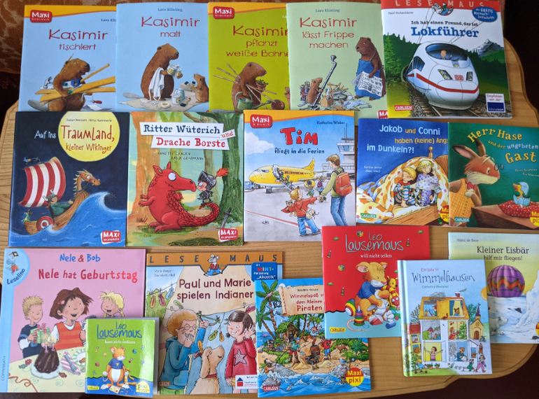 Набор немецких тоненьких книжек, которые мы привезли с собой, они все регулярно читаются с папой. Без бобра Кастора никуда уже второй год😁
