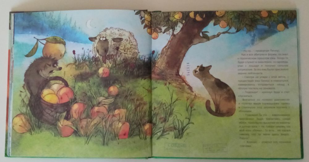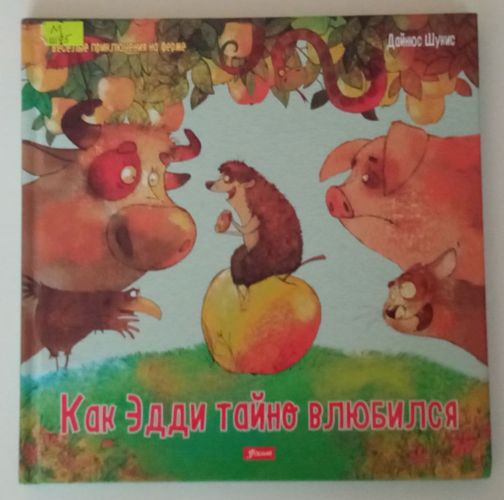 "Как Эдди тайно влюбился" - история о том как ежик влюбился в корову, а кот Пинкус помогал ему достать в подарок для возлюбленной бананы. Книга на дочку впечатление не произвела. Из всей истории ей запомнился только смешной момент - как Эдди и Пинкус катали поросенка.