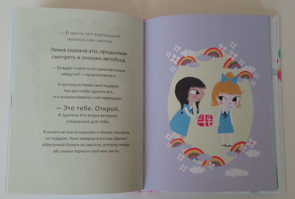 В "Мирись, мирись, мирись" сюжет про двух подруг Лилю и Ленку, про их переживания во время соры. История рассказывается от лица обеих героинь по очереди, но из-за этого постоянно путаешься в том, от лица какой из девочек читаешь в данный момент.