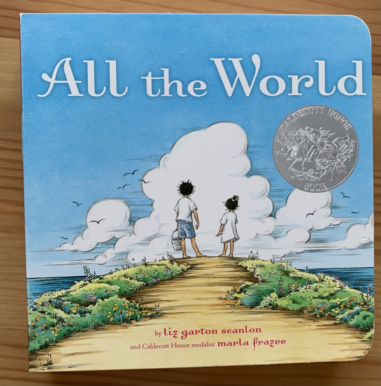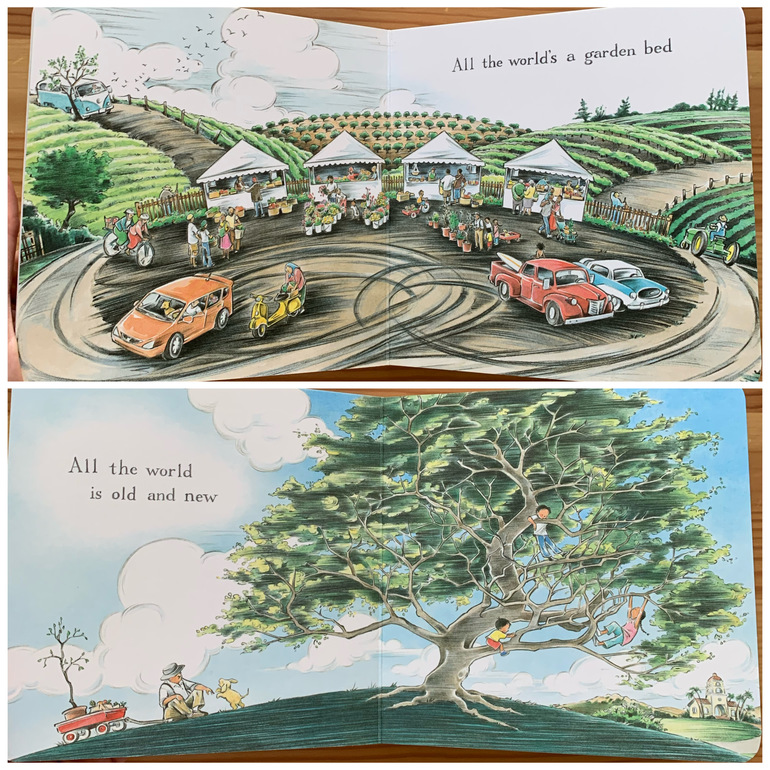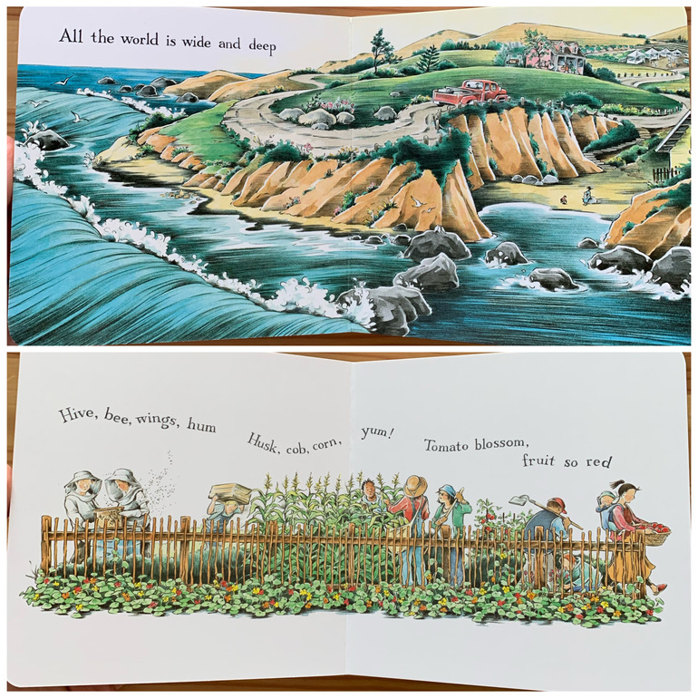 И напоследок я хочу вам показать книгу, которая не вызывает у сына сильного интереса (он смотрит картинки, когда я беру почитать ему эту книгу, но сам её никогда не выбирает для чтения ). Но в этой книге не иллюстрации, а настоящее искусство, именно поэтому я хочу поделиться ею с вами. Книга на английском, называется «All the world ». Смотрите сами, какая она потрясающая: