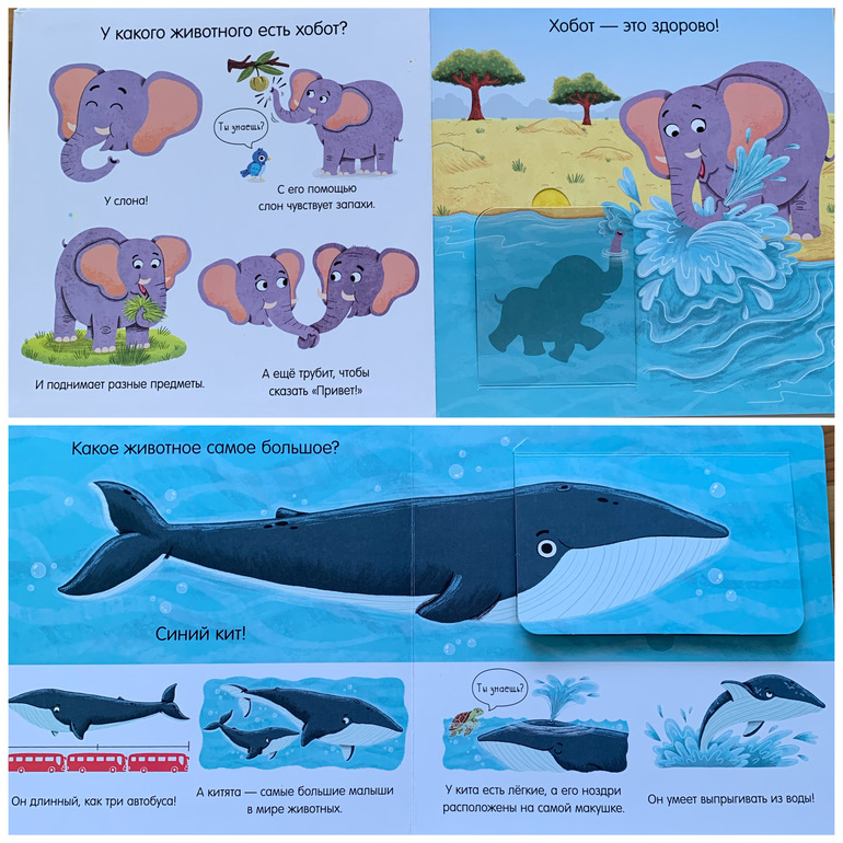 А вот «Животные» очень нравятся. Там всего одно окошко на разворот, каждый из которых посвящён одному животному. По некоторым у меня возникли вопросы (например, синие киты не выпрыгивают из воды):