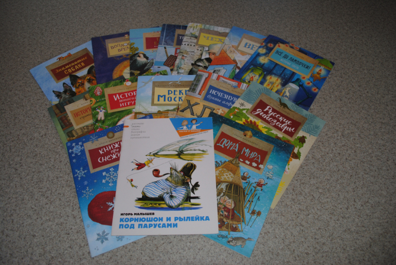 Корнюшон и Рылейка - единственная художественная книга. У нас есть полный вариант, но Тёма его так и не прочел. Про тоненькую сказал, что в целом интересно, и большую он прочесть хочет, но потом когда нибудь. Думаю, тоже до младших останется.