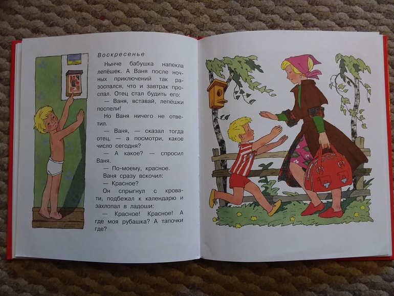 С дочкой не перечитывали года три, достала для сына. Первые истории очень хорошо слушал. А я вот задумалась - сменится поколения-два, и многое надо объяснять будет. Или вот история с цыпленком, когда Ваня решил посмотреть, как там цыпленок в яйце живёт, и соответственно у нас мёртвая животинка. Да я почти уверена, что и сейчас есть родители, которые не будут этого читать. А вообще язык у Воронковой чудесный, такой детский и понятный. Неделька - самое чудесное в книге ))