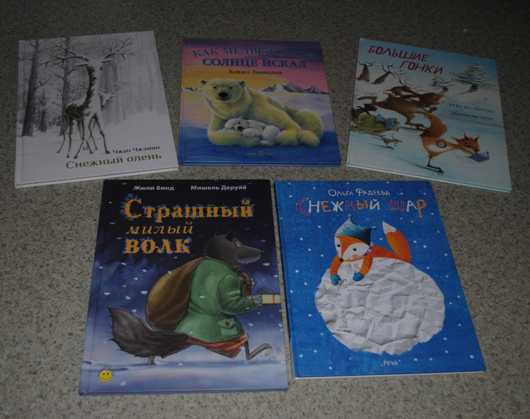 "Снежный олень" - грустный и лиричный, читать нечего, а настроение создает. "Как медвежонок солнце искал" очень красивая, с невероятно глубоким цветом. Текст корявый, но в этом случае я прощаю. "Снежный шар" ребята сами напомнили, чтоб я достала, как раз ведь зимний, нравится им. "Страшный милый волк" и "Большие гонки" более забавные книги. Белка - всезнайка очень напоминает Гермиону, долго над этим смеялись.